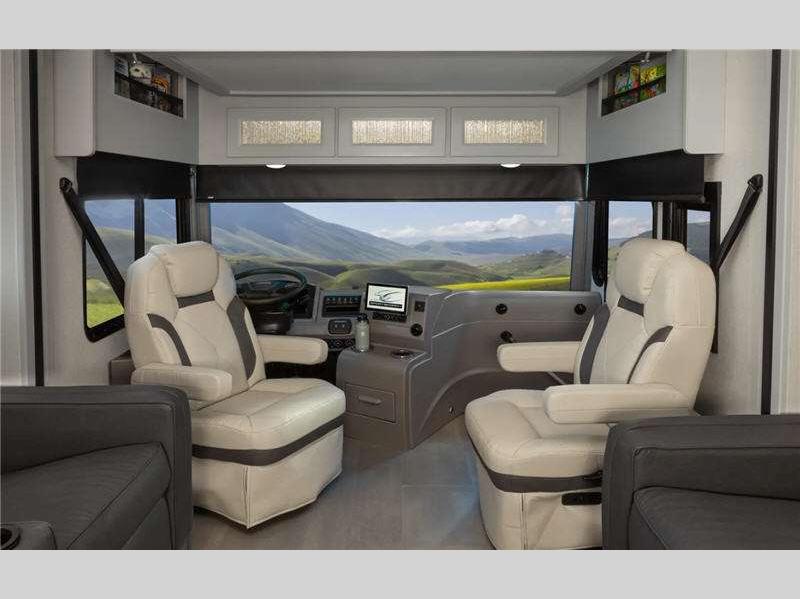 Ride high with the air ride suspension and air brakes, and set up easy with the fully automatic leveling jacks. There are practical innovations like the true flat floor bedroom design to eliminate climbing over the engine cover to get into bed, the side opening huge pass-through storage area on the outside for easy access to your supplies, and the smart design of the interior storage so you can bring what you want. You can gaze out at your beautiful sceneries every where you go with the frameless tinted windows that provide a panoramic view!