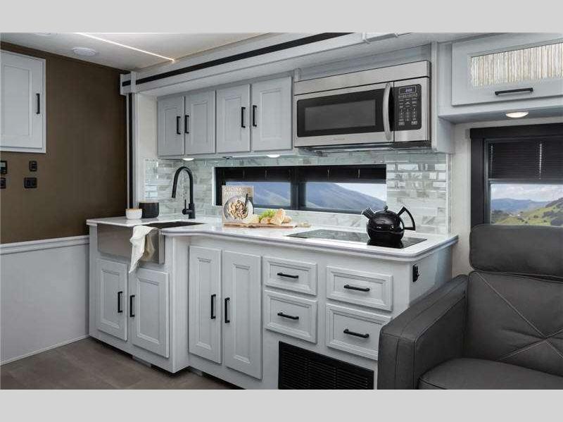 Sleeps 7 Slides 3 Length 41 ft 1 in Ext Width 8 ft 6 in Ext Height 12 ft 10 in Interior Color Chiffon, Sandcastle Exterior Color Red Rock Canyon Full Body Paint, Royal Gorge, Waimea Canyon Hitch Weight 10000 lbs GVWR 32000 lbs Fresh Water Capacity 89 gals Grey Water Capacity 104 gals Black Water Capacity 52 gals Tire Size 22.5" Furnace BTU 40000 btu Generator 8.0kW Diesel Fuel Type Diesel Engine ISB Cummins Rear Diesel Chassis Raised Rail Freightliner Horsepower 360 hp Fuel Capacity 100 gals Wheelbase 266 in Number Of Bunks 2 Available Beds King Torque 800 ft-lb Refrigerator Type Residential Stainless Steel Cooktop Burners 2 Shower Size 38" x 26", 38" x 30" Number of Awnings 1 Axle Weight Front 12000 lbs Axle Weight Rear 20000 lbs LP Tank Capacity 84 lbs Water Heater Type On Demand AC BTU 30000 btu TV Info LR 50" Smart TV, BR 32" Smart TV, Ext. TV Awning Info 18' Power Washer/Dryer Available Yes Gross Combined Weight 42000 lbs Shower Type Standard Electrical Service 50 amp Similar Floorplans