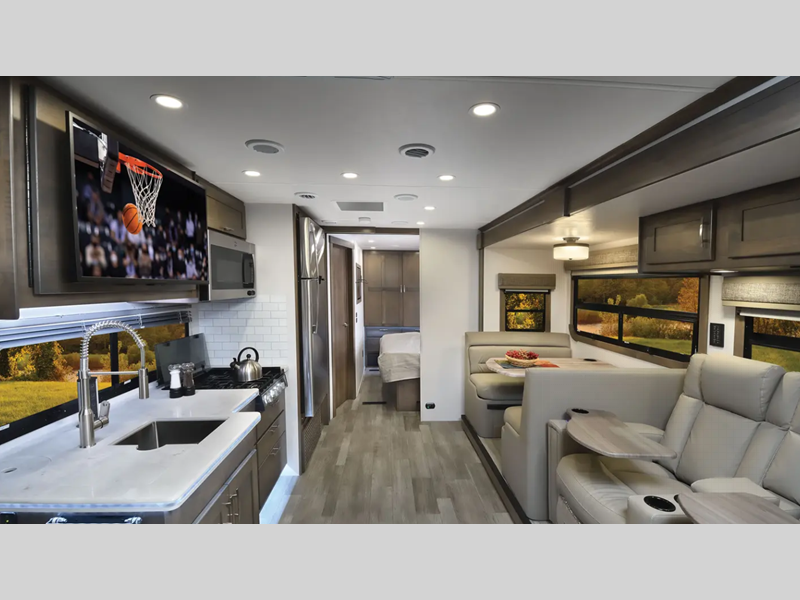 You will love the convenient amenities that have been included, like the multiplex wiring with a touch screen command center, the on-demand water heater, and the maintenance-free house battery with a single 200W solar panel to go off-grid when you choose. Inside, you'll find leatherette captain's seats with air ride, solid surface countertops with LED edge lighting, hardwood shaker-style cabinetry, and many more luxuries.