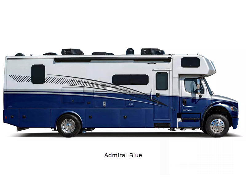 Sleeps 5 Slides 2 Length 33 ft 5 in Ext Width 8 ft 5 in Ext Height 12 ft 9 in Interior Color Desert, Milano, Crescent (Dealer Stock Only) Exterior Color Admiral Blue, Khaki, Merlot, Quicksilver, Stone Ridge Hitch Weight 12000 lbs GVWR 33000 lbs Fresh Water Capacity 94 gals Grey Water Capacity 52 gals Black Water Capacity 52 gals Tire Size 275/80R 22.5 Furnace BTU 40000 btu Generator 8kW Onan Diesel Fuel Type Diesel Engine Cummins B6.7 Turbo Diesel Chassis Freightliner M2 106B Plus Horsepower 360 hp Fuel Capacity 100 gals Wheelbase 245 in Available Beds King Torque 800 ft-lb Refrigerator Type Residential w/Ice Maker Refrigerator Size 16 cu ft Convection Cooking Yes Cooktop Burners 3 Shower Size 36" x 36" Number of Awnings 1 Axle Weight Front 12000 lbs Axle Weight Rear 21000 lbs LP Tank Capacity 20.3 gals Water Heater Type On Demand LP AC BTU 30000 btu TV Info LR 39" LED Smart TV, BR 32" LED Smart TV, Ext. 32" LED Smart TV Awning Info 16' Armless w/LED Lighting and Motion Activated Retraction Washer/Dryer Available Yes Gross Combined Weight 46000 lbs Shower Type Standard Electrical Service 50 amp Similar Floorplans