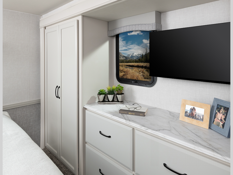 A few of the stand-out features include a Ford engine and Ford chassis for a more reliable ride, an 8,000 lb. hitch for your towing needs, and a PowerLock System ll with sidewall-to-roof structure construction for added durability. The MultiPlex house controls will allow you to control things with your smart phone or tablet as you travel, and an exterior entertainment center with an LED TV means you can watch the big game outdoors!