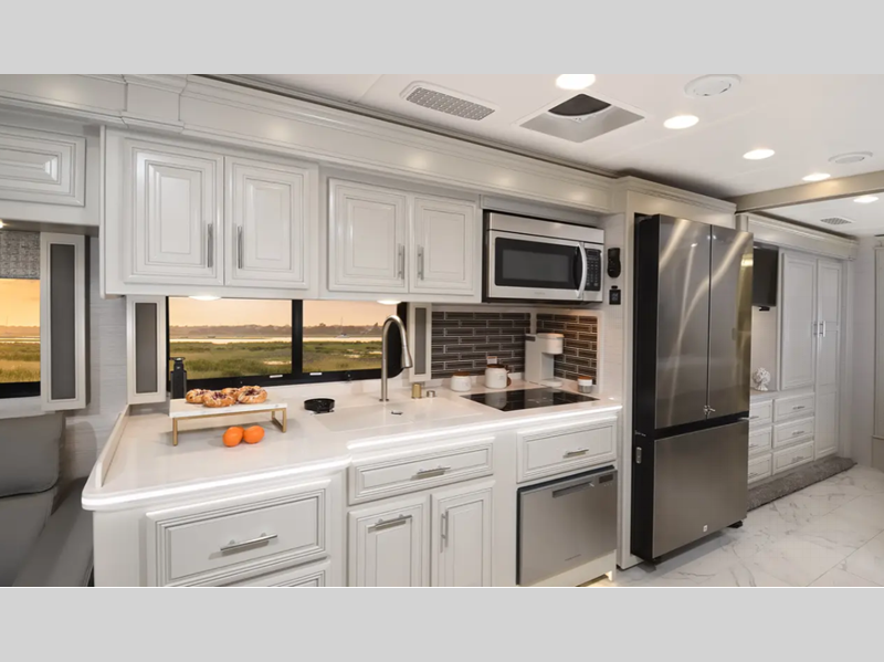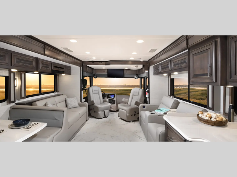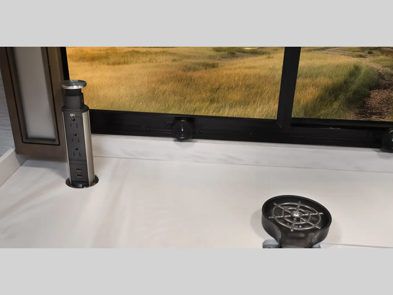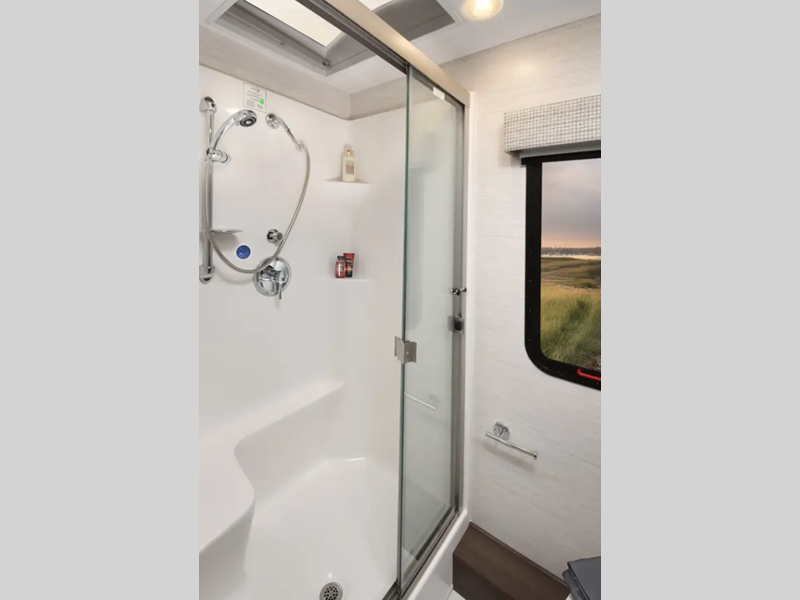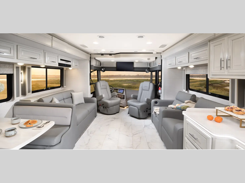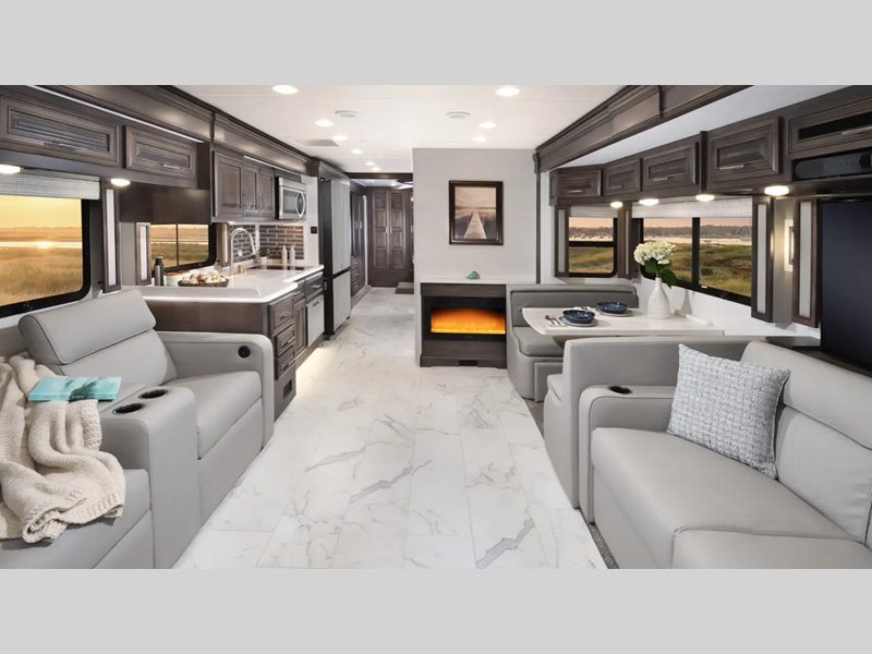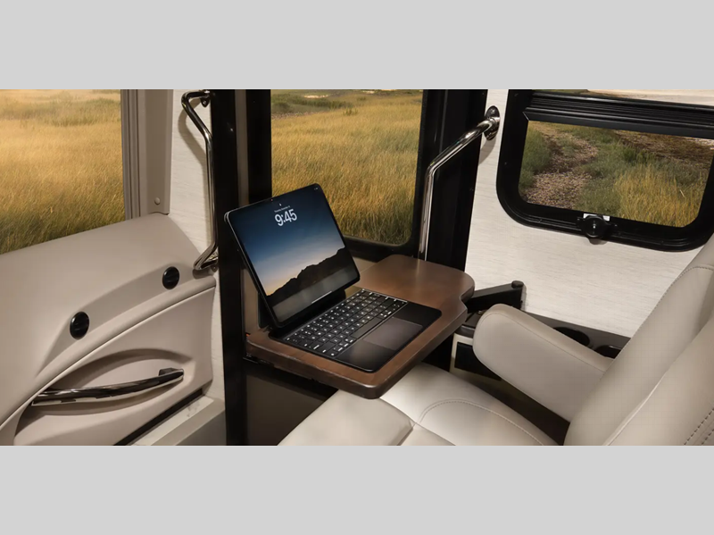 A passenger seat workstation lets your co-pilot get some work done as you drive and a 10" dash radio with color back up and side view cameras plus navigation will help get you to your destination safely and on time. The full body exterior paint is sure to turn heads as you travel and the 4-point fully auto hydraulic leveling system will have you set up at the campground in no-time! You will also love the interior with its polished porcelain tile throughout, hardwood cabinetry, roller day/night shades, and more comforts!
