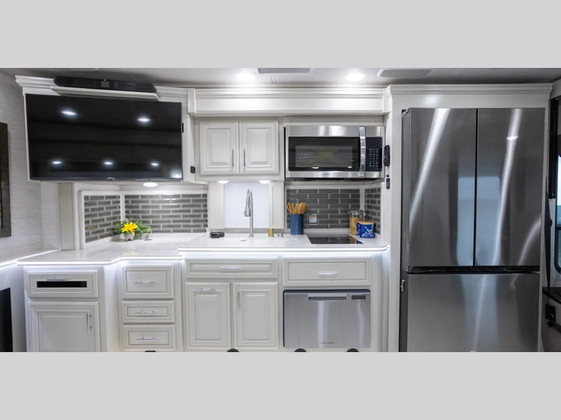 Sleeps 8 Slides 3 Length 41 ft Ext Width 8 ft 4 in Ext Height 12 ft 9 in Int Height 7 ft Exterior Color Cardinal, Deep Sea, Imperial Red, Iridium, Lunar, Tungsten Hitch Weight 15000 lbs GVWR 38320 lbs Fresh Water Capacity 103 gals Grey Water Capacity 66 gals Black Water Capacity 42 gals Generator 10kW Onan Diesel Fuel Type Diesel Engine Cummins ISL Turbo Chassis Freightliner XCR Raised Rail Horsepower 380 hp Wheelbase 266 in Number Of Bunks 1 Available Beds Tilt-A-View King Torque 1150 ft-lb Refrigerator Type Residential French Door w/ Ice Maker Refrigerator Size 23 cu ft Convection Cooking Yes Cooktop Burners 2 Number of Awnings 2 Axle Weight Front 14320 lbs Axle Weight Rear 24000 lbs Water Heater Type Oasis Hydronic Continuous AC BTU 45000 btu TV Info LR LED TV, BR 32" LED TV, Cab 32" LED TV, Exterior 40" TV Awning Info 18' Carefree Latitude dual pitch with LED Lights & Wind Sensor, 56" Door Awning Washer/Dryer Available Yes Gross Combined Weight 53320 lbs Shower Type Standard Electrical Service 50 amp Similar Floorplans