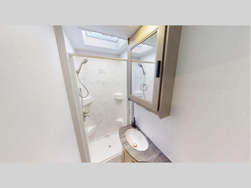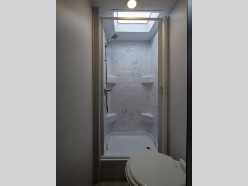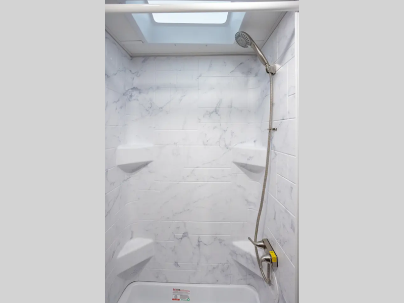 The exterior consists of a crowned, laminated fiberglass roof, a one-piece seamless fiberglass cap, awning toppers over the slide outs, an integrated entry step, and 2"-thick gel-coat sidewalls with lightweight composite waterproof material. The sideview and backup cameras will help you park your coach, and the high-pressure oxygen-infused shower head will give you a pleasant shower experience. You'll also have a Maxx Air multi-speed power fan with cover in the kitchen, and another kitchen feature you'll love is the 1.3-cubic foot convection microwave. You also have the ability to add an optional solar-powered 12V charging system.