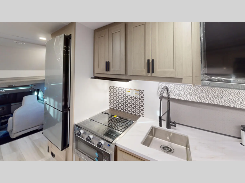 Sleeps 6 Length 24 ft 6 in Ext Width 8 ft 5 in Ext Height 11 ft 3 in Hitch Weight 5000 lbs GVWR 12500 lbs Fresh Water Capacity 44 gals Grey Water Capacity 39 gals Black Water Capacity 39 gals Furnace BTU 30000 btu Generator 4.5KW Gas Fuel Type Gasoline Chassis Ford E350 Fuel Capacity 55 gals Wheelbase 158 in Number Of Bunks 1 Available Beds Queen Refrigerator Type 12V Refrigerator Size 10.7 cu ft Convection Cooking Yes Cooktop Burners 3 Shower Size 24" x 32" Number of Awnings 1 Axle Weight Front 5000 lbs Axle Weight Rear 8500 lbs LP Tank Capacity 41 lbs Water Heater Capacity 6 gal Water Heater Type DSI Gas/Electric AC BTU 15000 btu TV Info LR 12V LED TV Awning Info 15' 6" Electric with LED Lights Gross Combined Weight 18000 lbs Shower Type Standard Electrical Service 30 amp Similar Floorplans