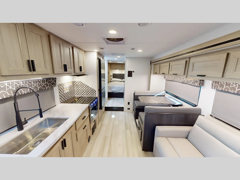 Sleeps 7 Slides 1 Length 31 ft 5 in Ext Width 8 ft 5 in Ext Height 11 ft 3 in Hitch Weight 7500 lbs GVWR 14500 lbs Fresh Water Capacity 44 gals Grey Water Capacity 39 gals Black Water Capacity 39 gals Furnace BTU 30000 btu Fuel Type Gas Chassis Ford E450 Fuel Capacity 55 gals Wheelbase 220 in Number Of Bunks 1 Available Beds RV Queen Refrigerator Type 12V Refrigerator Size 10.7 cu ft Convection Cooking Yes Cooktop Burners 3 Shower Size 24" x 32" Number of Awnings 1 Axle Weight Front 5000 lbs Axle Weight Rear 9600 lbs LP Tank Capacity 41 lbs Water Heater Capacity 6 gal Water Heater Type DSI Gas/Electric AC BTU 15000 btu TV Info LR 12V LED TV Awning Info 15' 6" Electric with LED Lights Gross Combined Weight 22000 lbs Shower Type Standard Electrical Service 30 amp Similar Floorplans