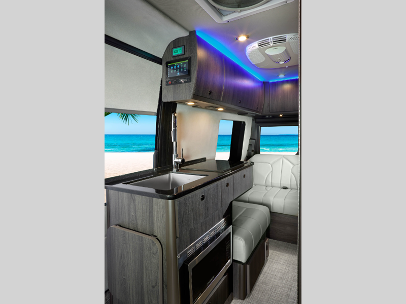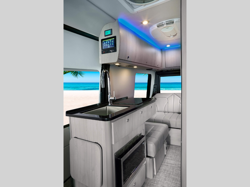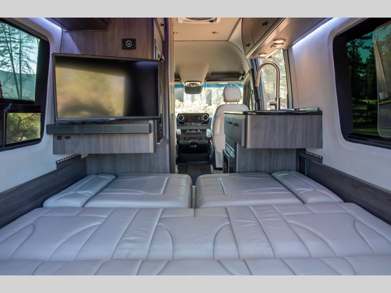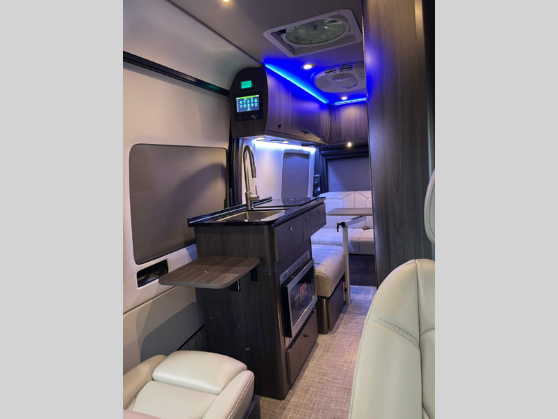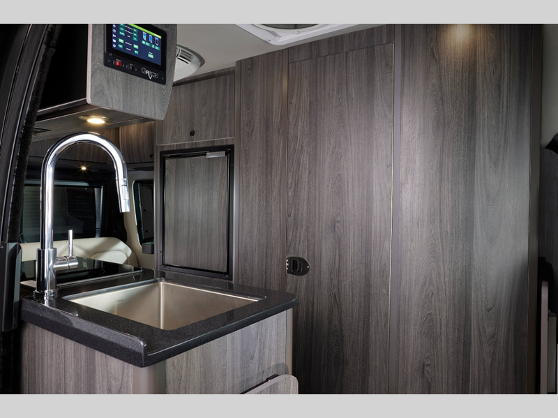 Sleeps 2 Length 19 ft 6 in Ext Width 6 ft 8 in Ext Height 10 ft Int Height 6 ft 1 in Exterior Color Tenorite Grey, Iridium Silver, Grey White Hitch Weight 5000 lbs Fresh Water Capacity 16 gals Grey Water Capacity 26 gals Black Water Capacity 13 gals Fuel Type Diesel Engine Four Cylinder High Output Chassis Mercedes-Benz Sprinter 2500 Horsepower 211 hp Wheelbase 144 in Torque 332 ft-lb Refrigerator Type Refrigerator/Freezer Convection Cooking Yes Cooktop Burners 2 Number of Awnings 1 Water Heater Type Tankless AC BTU 15000 btu TV Info Coach 24" LED TV with Apple TV Awning Info Power with LED Lights Shower Type Wet/Bath Shower Electrical Service 30 amp Similar Floorplans
