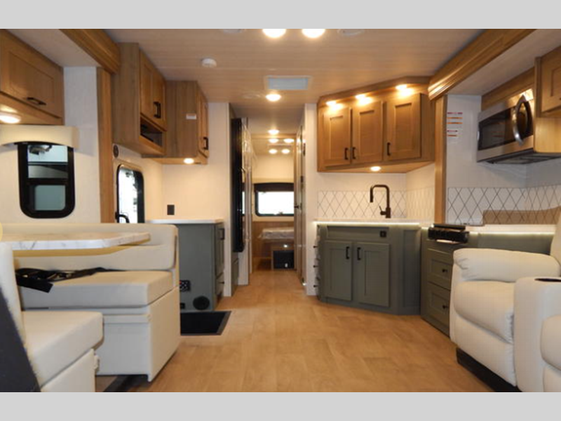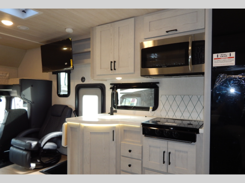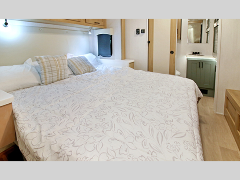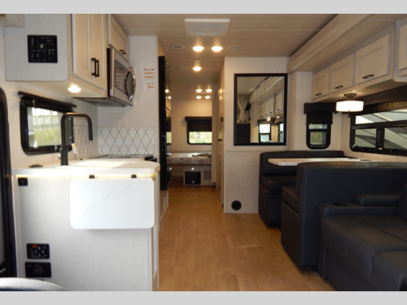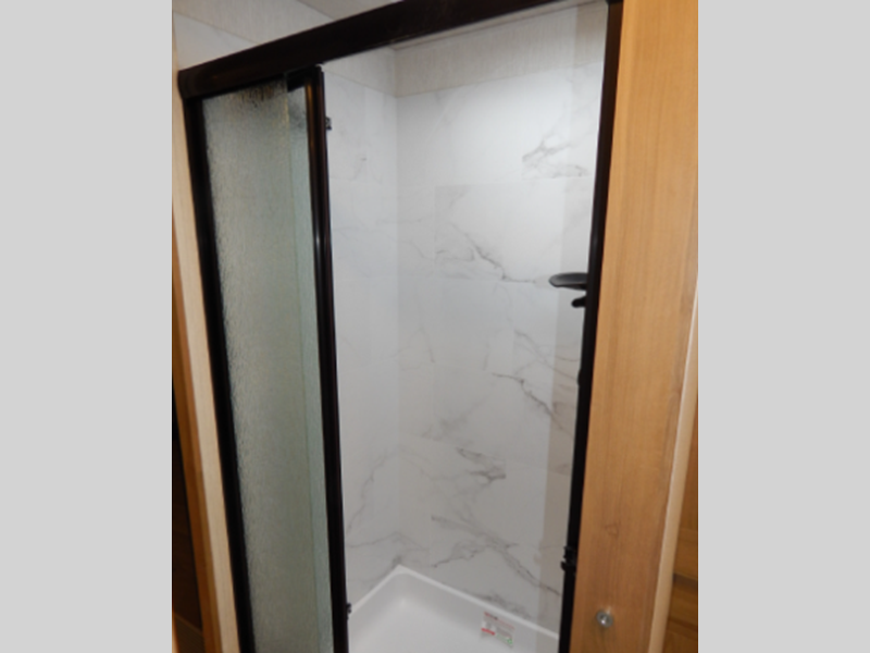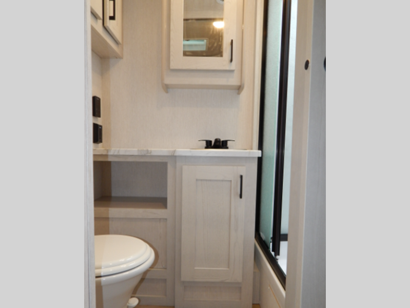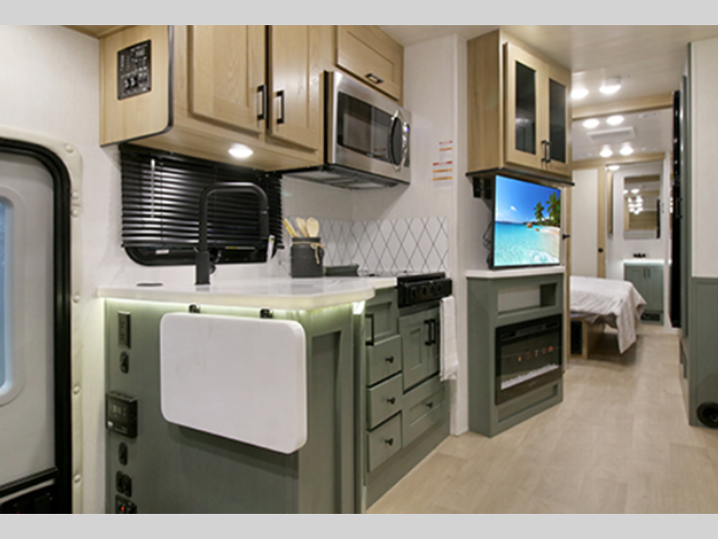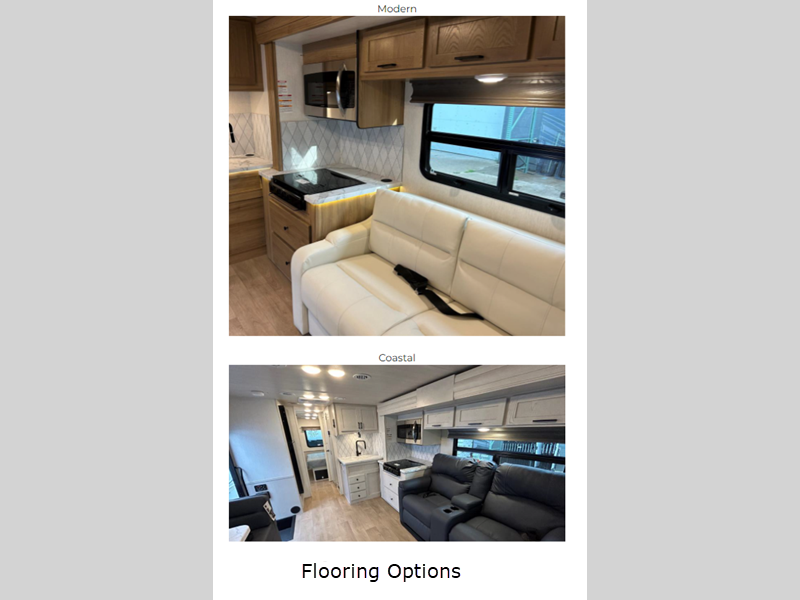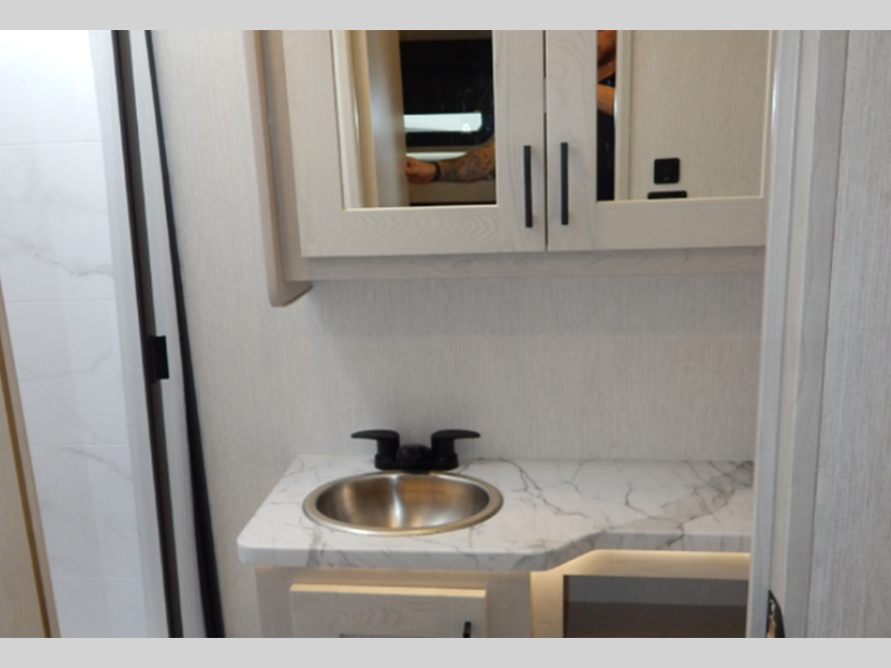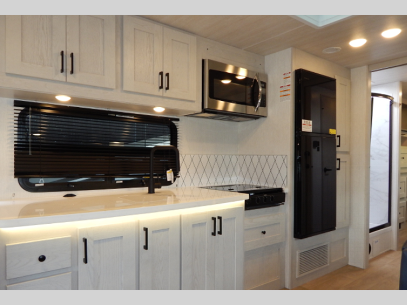 These luxury units are packed full with quality features like a deluxe innerspring mattress, upgraded flooring, and solid surface kitchen countertops. You will appreciate having a water filtration system throughout as well as an on-demand hot water heater for added convenience. The deluxe 4-color full body paint and frameless windows are sure to turn heads down the highway, and the full automatic leveling jacks will have you set up in no-time!