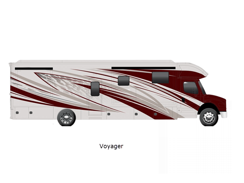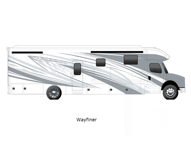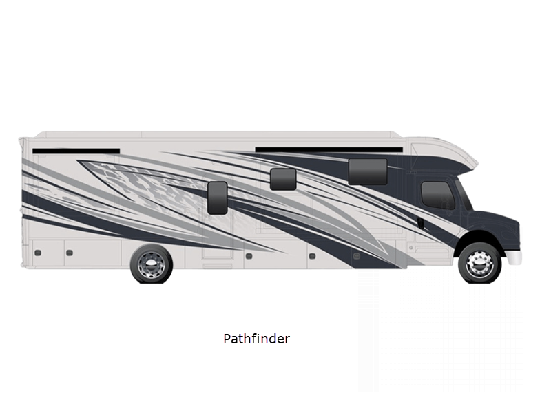 Sleeps 5 Slides 3 Length 37 ft 6 in Ext Width 8 ft 4 in Ext Height 12 ft 10 in Int Height 7 ft Interior Color Oak Bluffs, Seabrooke, Westfield Exterior Color Pathfinder, Ranger, Trailblazer, Voyager, Wayfinder, Polaris, Tundra, Atlas LR, Mojave Hitch Weight 20000 lbs GVWR 37600 lbs Fresh Water Capacity 150 gals Grey Water Capacity 75 gals Black Water Capacity 75 gals Generator 8KW Onan Quiet Diesel Fuel Type Diesel Engine Cummins L9 Chassis Freightliner M2-106 Plus Horsepower 360 hp Fuel Capacity 100 gals Wheelbase 285 in Available Beds Mini King Torque 1150 ft-lb Refrigerator Type French Door Residential w/Stainless Steel Doors Refrigerator Size 18 cu ft Convection Cooking Yes Cooktop Burners 2 Number of Awnings 1 Water Heater Type AquaHot 450D Hydronic AC BTU 30000 btu TV Info LR 50" 4K Smart LED TV, BR 32" 4K Smart LED TV, Ext. 43" 4K LED TV Awning Info Girard 2-Stage Lateral w/LED Lights w/End Caps Washer/Dryer Available Yes Shower Type Radius Electrical Service 50 amp Similar Floorplans