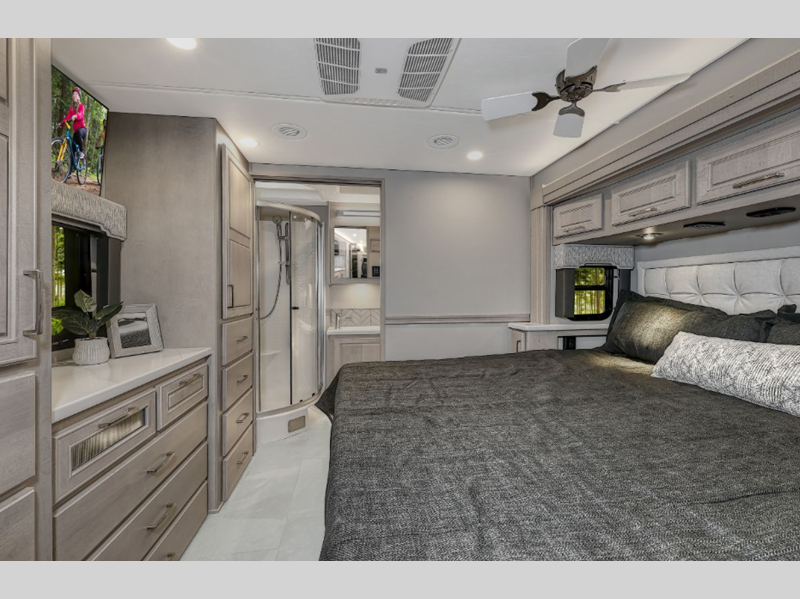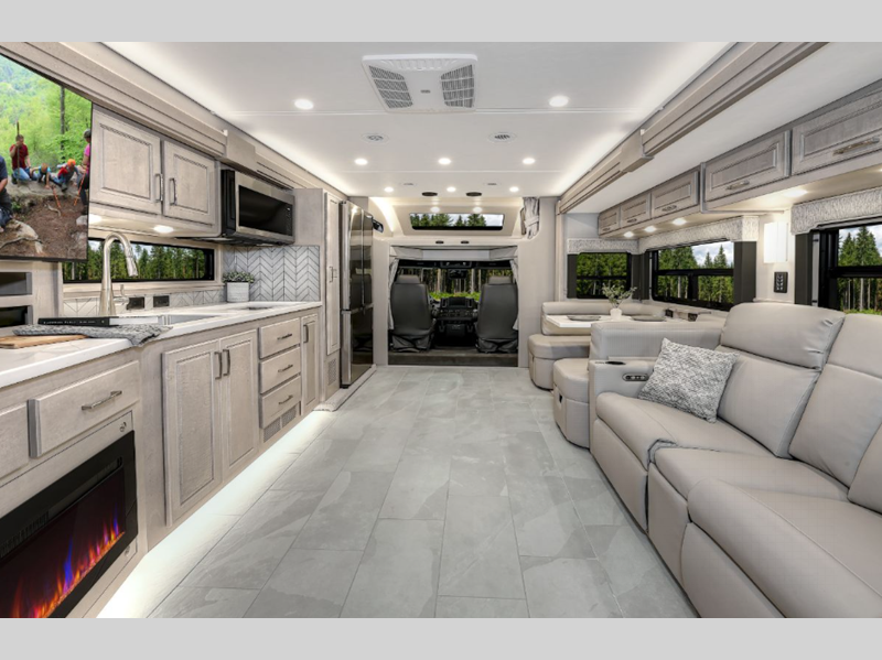 Each model sits on a durable Freightliner M2-106 Plus chassis with a Cummins L9 engine and 360 horsepower to power your trips both near and far. The Aqua-Hot 450D hydronic water and zone heating system provides endless hot water and will keep your whole coach comfortable. More convenient features include the Multiplex Control system, four-point hydraulic leveling, and a roof-mounted Girard 2-stage lateral arm awning. Inside, you will be met with maple hardwood cabinetry, solid surface countertops, stylish tile backsplash, and a cozy memory foam mattress.