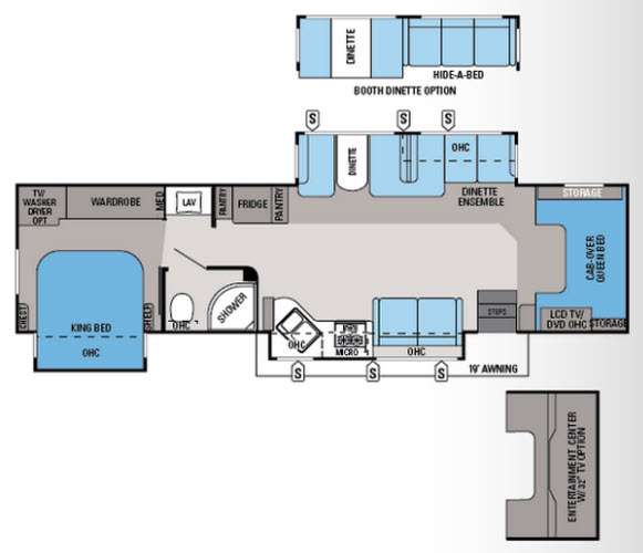 The Seneca 37TS motor home offers triple slides, and much room in the main living area. As you enter the motor home, to the left is a slide with a sofa, microwave, hide-a-bed and double kitchen sink. The opposite side offers a dinette ensemble slide, pantry, refrigerator, and second pantry. In the front you will find a front cab-over queen bed, storage, and a LCD TV/DVD. The bathroom has a toilet, and shower on one side of the motor home, and a sink and medicine cabinet on the other side of the motor home. The rear bedroom offers a king bed slide, and a wardrobe. There are plenty of overhead cabinets throughout the inside of the motor home as well as exterior storage. You can even choose a few options such as a front entertainment center with a 32" TV, a booth dinette, and a washer and dryer.